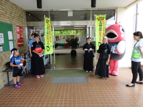 中川警察署と中川区役所、そして子供たちが中川区のマスコットキャラクター “ナッピー”と一緒に