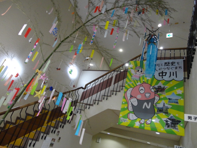 七夕飾りの奥にあるタペストリー